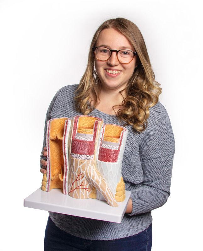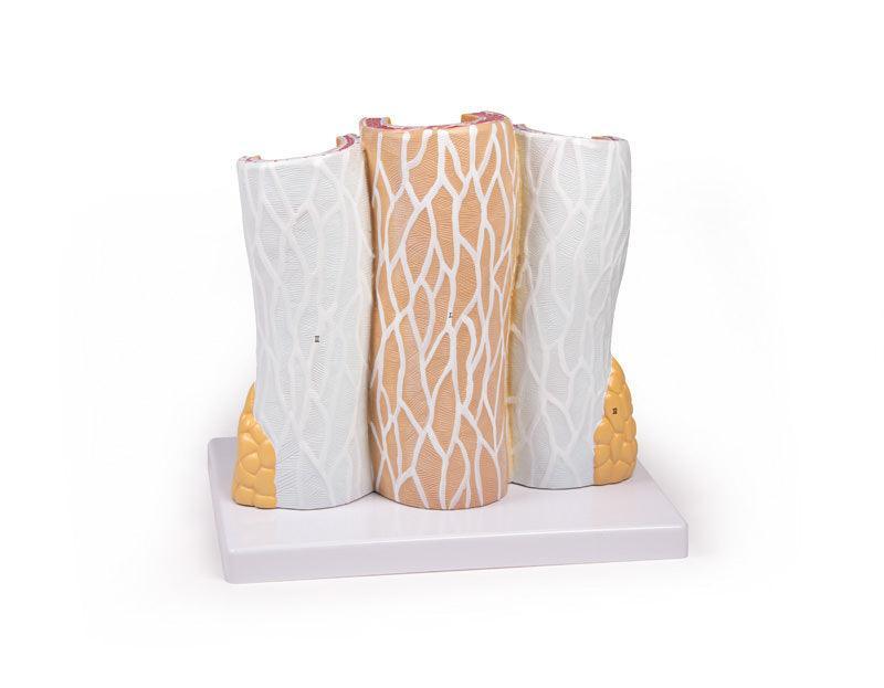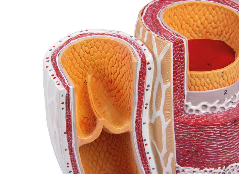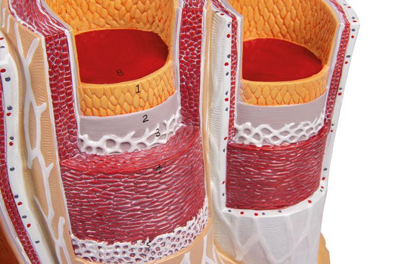 Ein wichtiges Hilfsmittel, um den Unterschied zwischen Arterien- und Venen- Histologie zu verstehen. Dieses einteilige Modell zeigt detailgenau zwei Venen und eine Arterie. Eine Vene ist longitudinal geschnitten und zeigt die Venenklappen in offenem sowie geschlossenem Zustand. Die Arterie und die zweite Vene zeigen im Querschnitt die verschiedenen Schichten wie Tunica media, Membrana elastica und Tunica adventitia. Auf Sockel. Größe: 20 x 30 x 27cm, Gewicht: 0,8kg - Lieferzeit ca. 3 - 4 Wochen